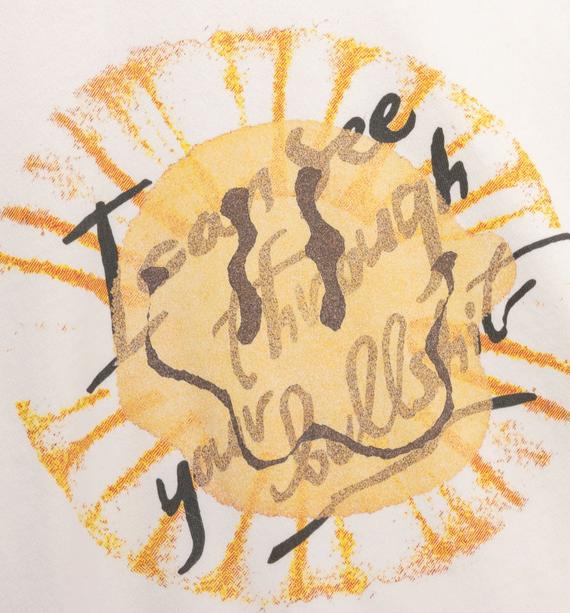 Make a statement with the ICSTYB Crewneck. Made from 100% cotton for comfort and breathability, this cream tee features a bold yellow sun graphic and handwritten "I can see through your bullshit" text on the chest. The long sleeves, ribbed crew neck, and relaxed fit make it perfect for everyday streetwear. Pair it easily with your favorite jeans or cargos for effortless style.