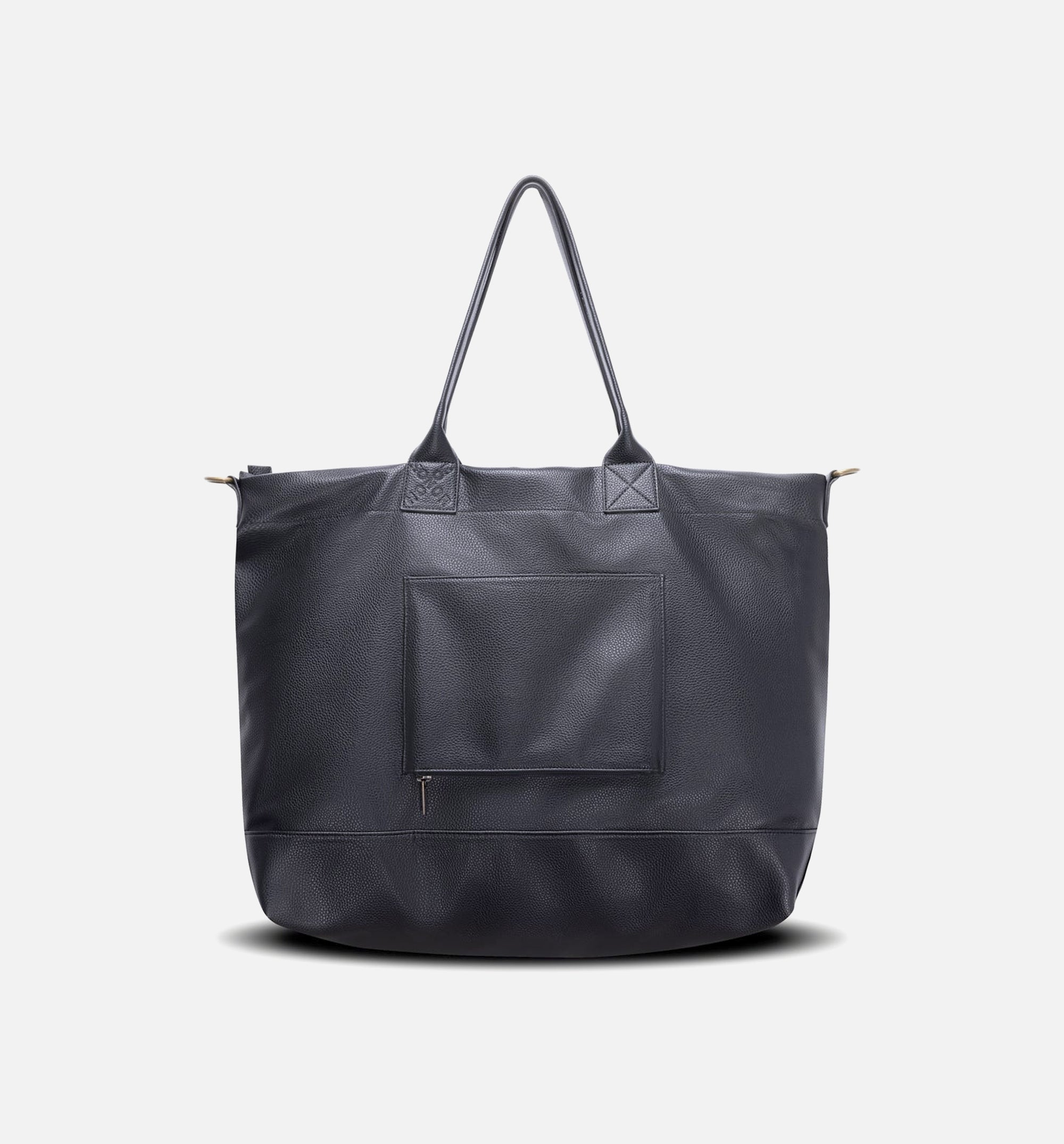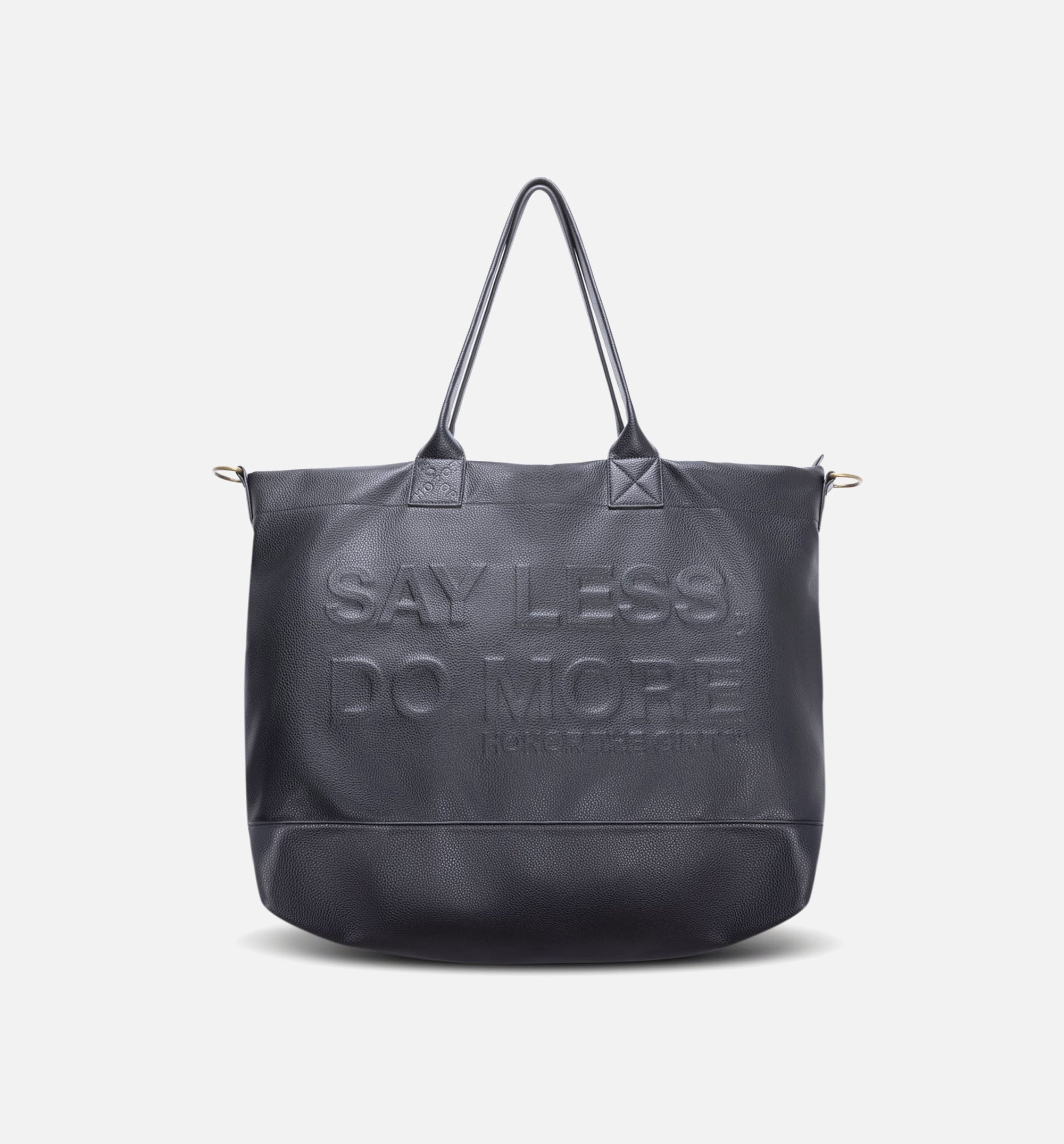 The Do More Tote is crafted for versatility and durability, featuring a black pebbled vegan leather exterior embossed with the bold slogan “SAY LESS, DO MORE.” The spacious, fully lined interior offers multiple zippered compartments for effortless organization. A discreet back zipper opens to slide over a suitcase handle, making this tote ideal for travel and everyday use.