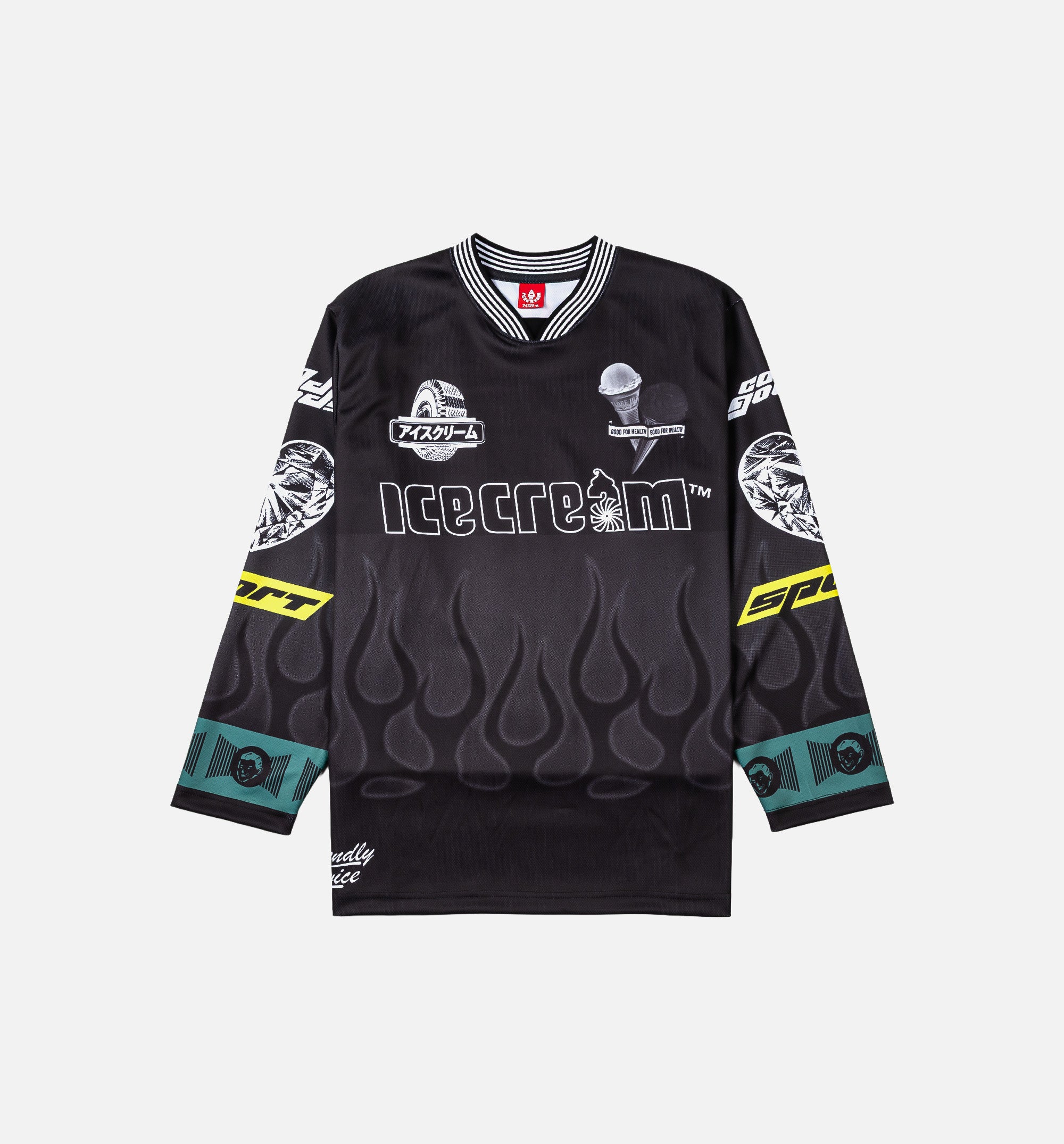 The Good Food LS Jersey features bold graphics, racing typography, and signature ICECREAM branding throughout.