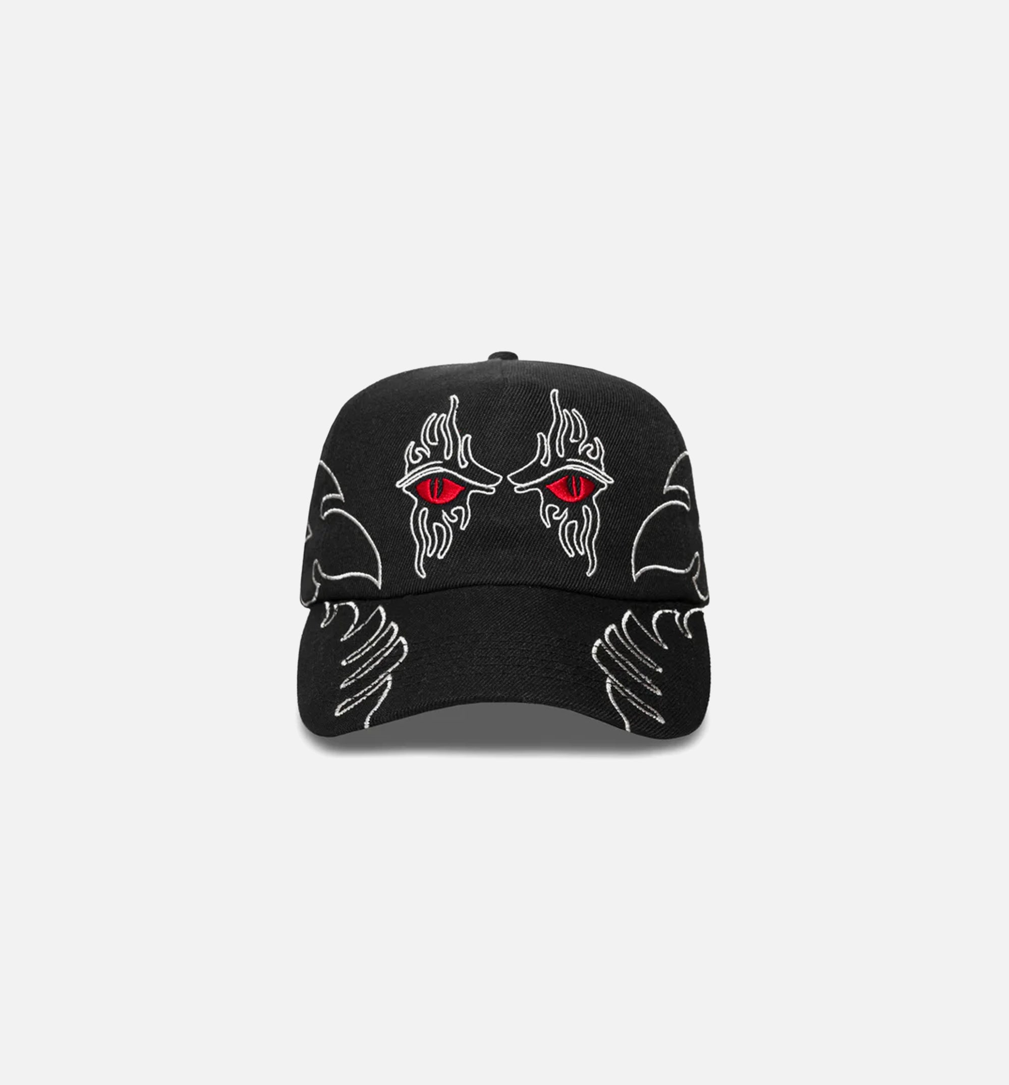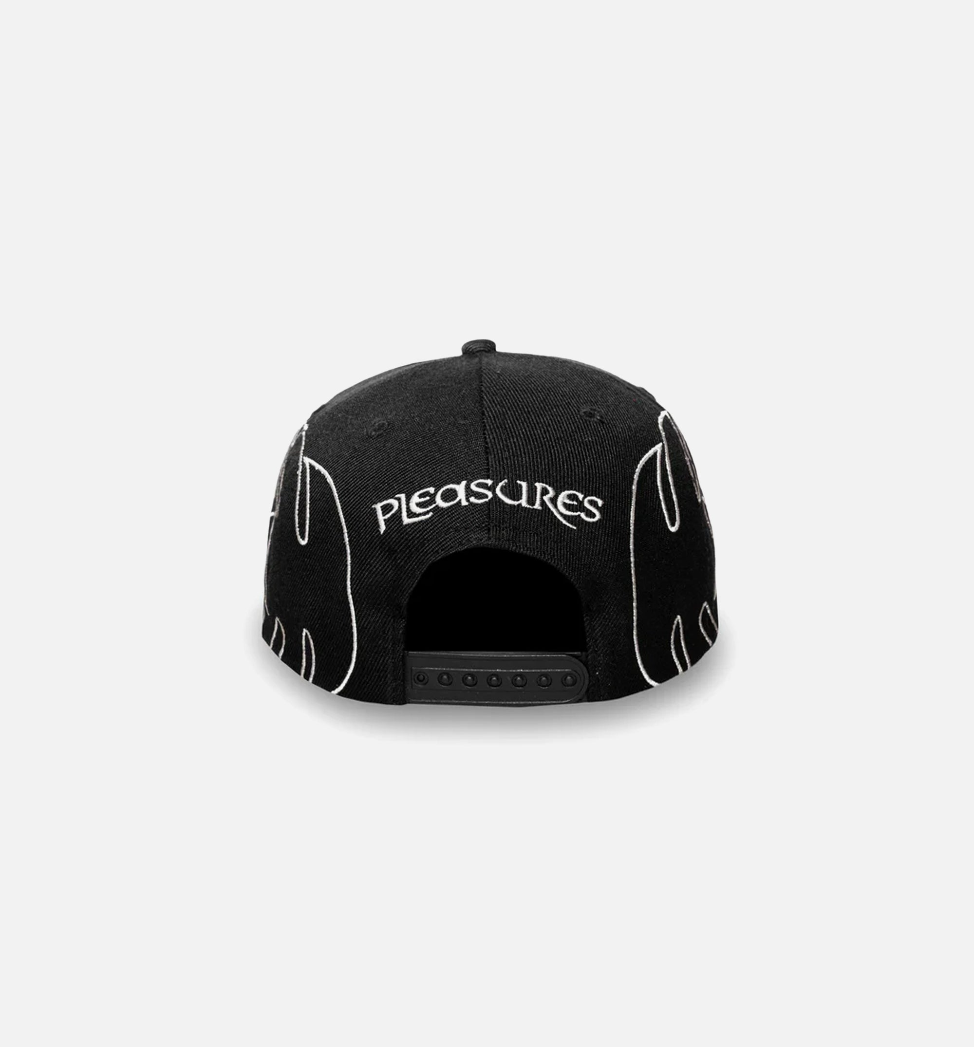 The PLEASURES Afterlife Snapback delivers a bold, haunting aesthetic rooted in the brand’s signature underground edge. Designed in black, the cap features intricate embroidered graphics with striking red eye details that create an intense, all-over visual. Finished with a structured crown and adjustable snapback closure, this hat blends provocative design with everyday streetwear functionality.